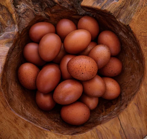 Originating from France the Marans are well-known for their strikingly dark, chocolate-brown eggs. This is a unique characteristic that is due to porphyrins, which are pigments in the eggs that oxidise to a dark brown colour when exposed to bright light. This results in eggs collected in spring and summer being darker than those collected in winter and autumn.